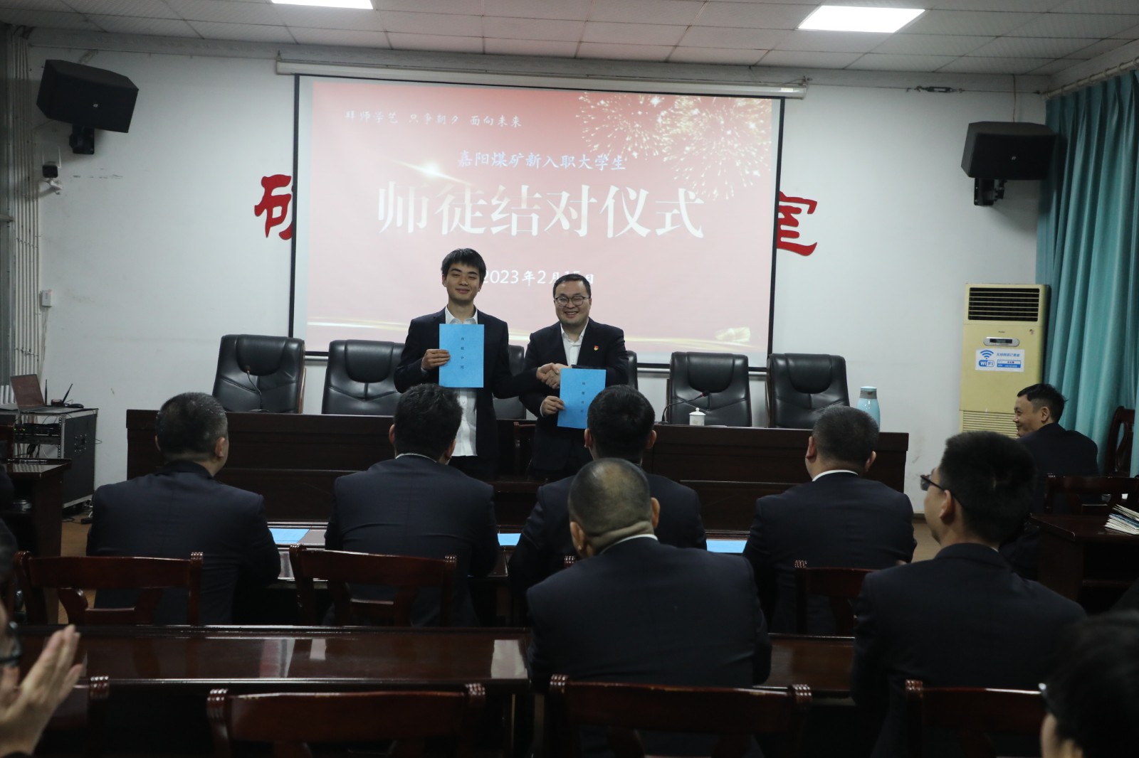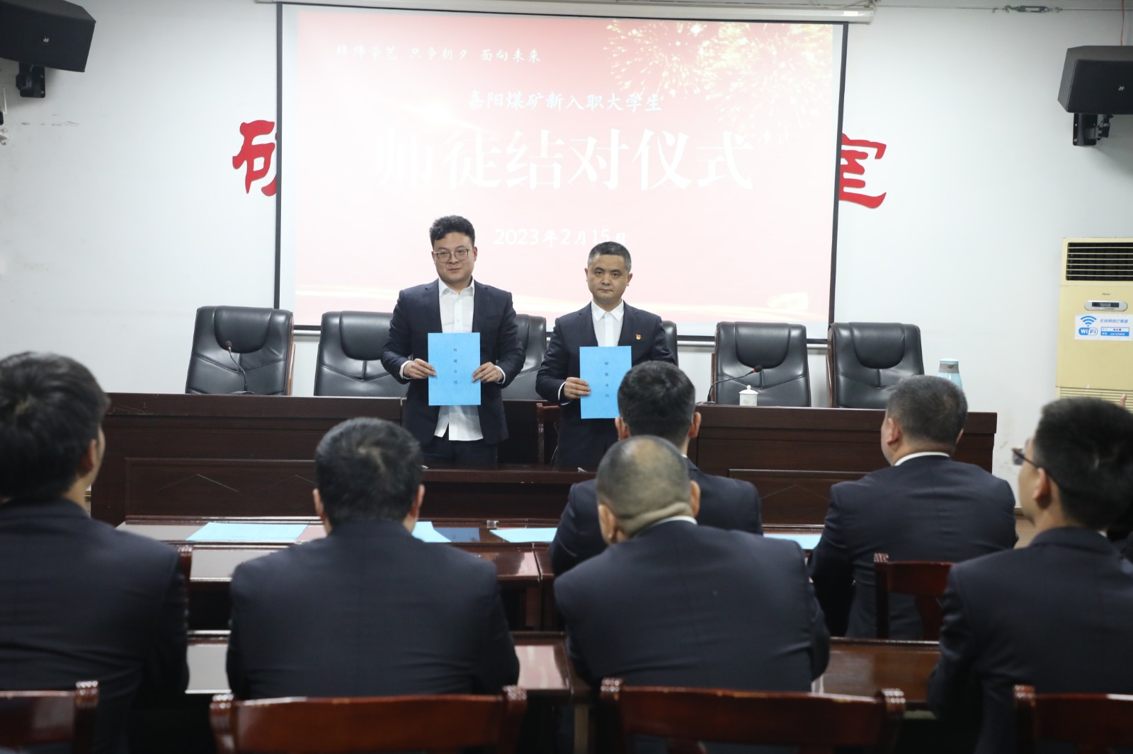 德赢(中国)职工培训学校校长程敏、嘉阳煤矿矿办领导参加了师徒结对仪式。