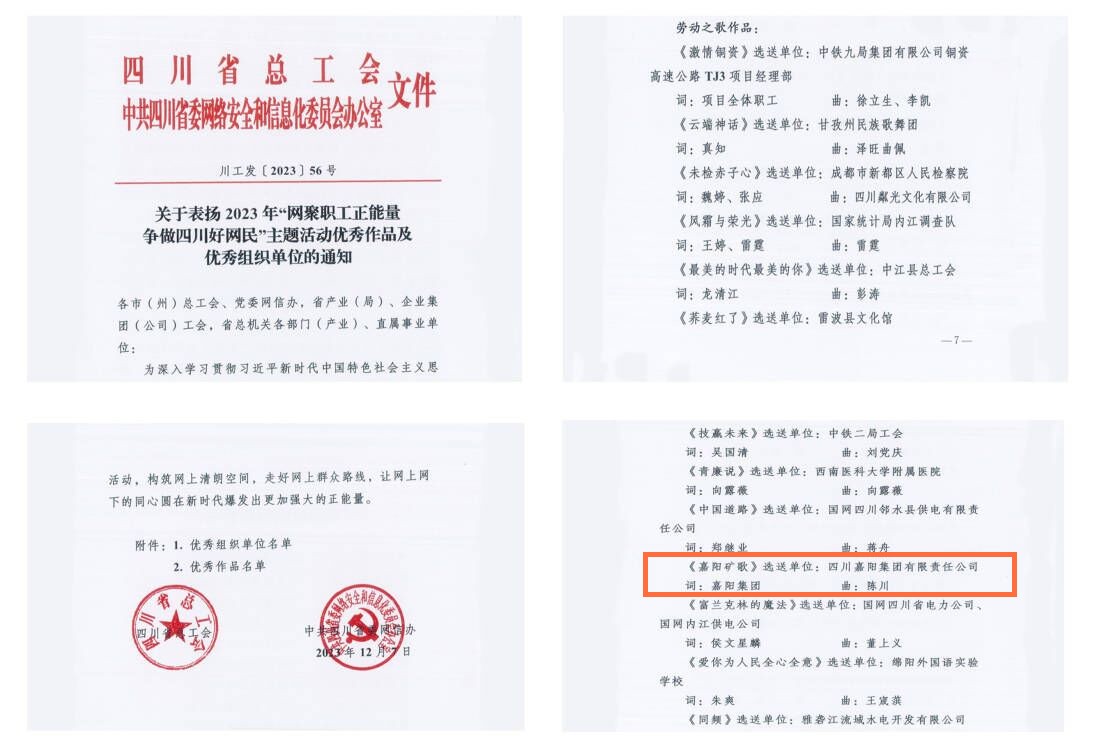 近日,四川省总工会下发《关于表扬2023年“网聚职工正能量争做四川好网民”主题活动优秀作品及优秀组织单位的通知》,由德赢(中国)报送的视频《嘉阳矿歌》获劳动之歌作品奖。