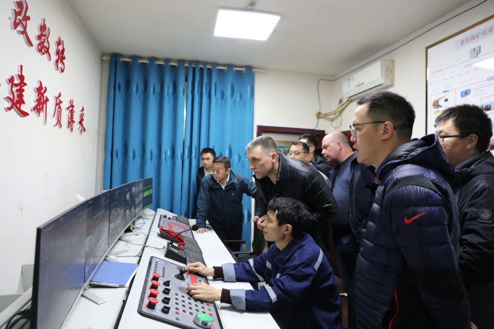 考察交流团深入12031采煤工作面实地察看了智能化综采生产流程,到1203设备道观看了智能化综采井下配套设备系统。先后到嘉阳煤矿采一队、采二队智能远程操控中心,观摩智能化远程操控简约规划开采实际操作,通过视频监控了解井下设备对应远程操控的运行情况,并对嘉阳煤矿自动化控制系统、远程监测技术以及智能化采煤工艺表现出浓厚兴趣。