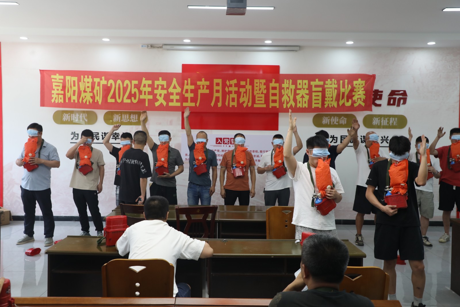 6月27日,嘉阳煤矿机电队会议室内,一场隔绝式压缩氧自救器盲戴比赛紧张而激烈,32名井下工作者齐聚一堂,共赴这场关乎生命安全的较量。