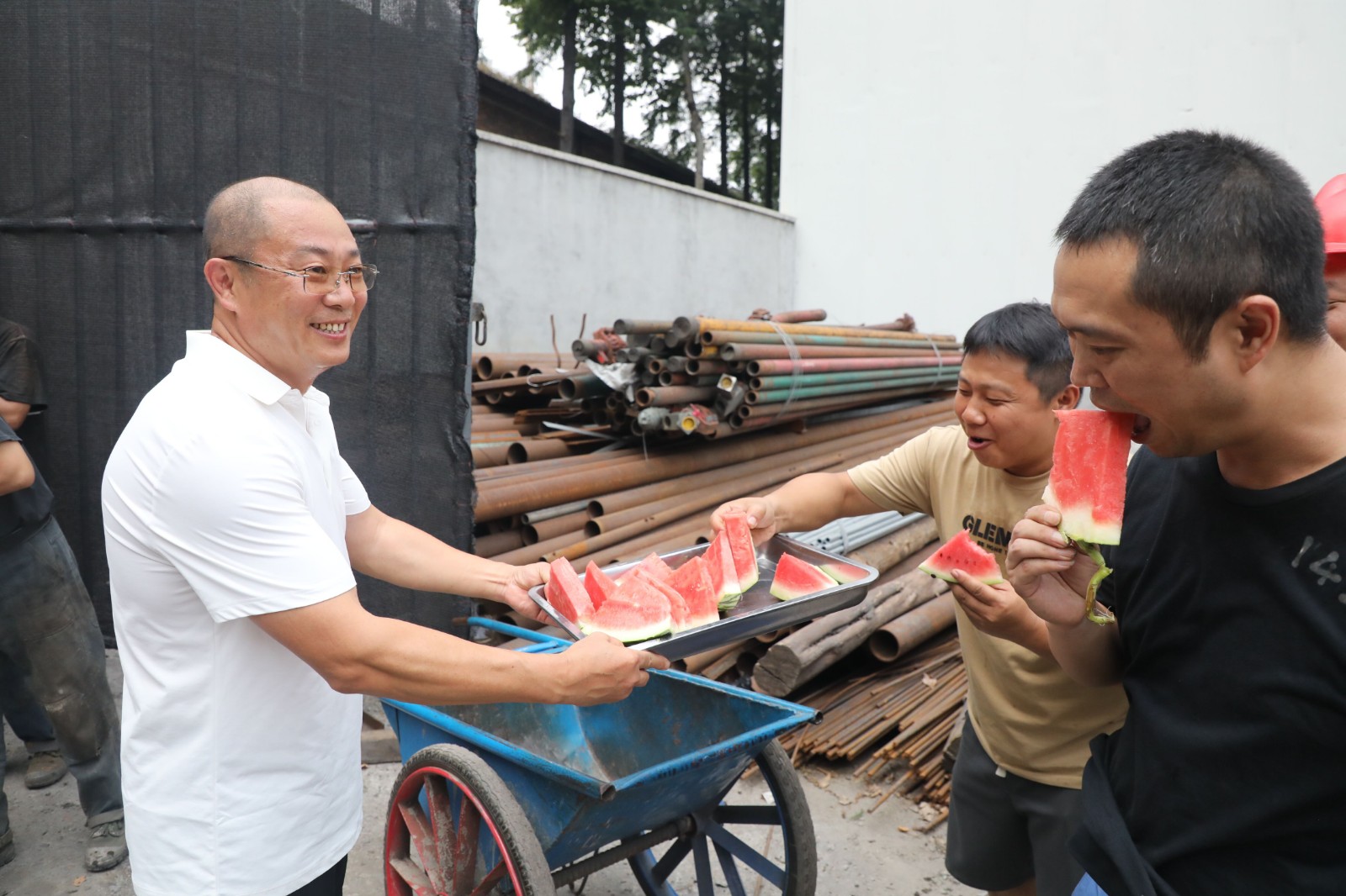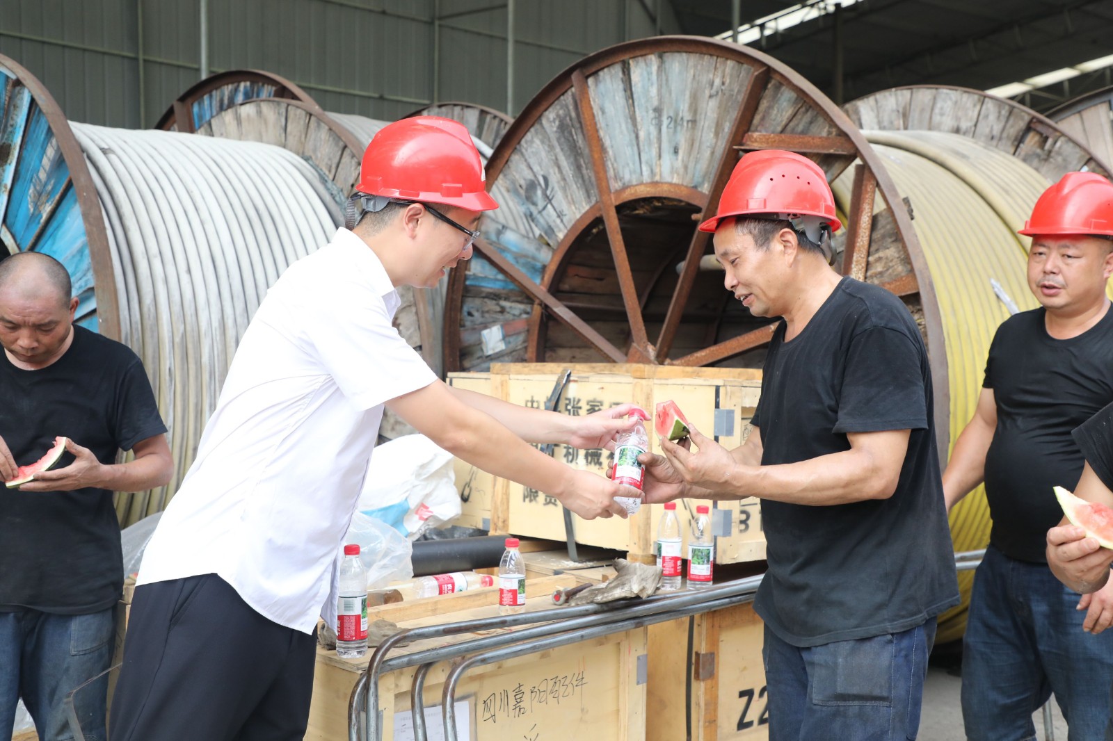 公司领导心系职工,深入生产车间,亲切慰问坚守岗位的干部职工。7月18日下午,党委副书记、总经理范勤英带领机关三支部的党员到嘉阳煤矿机电队开展送清凉活动,亲手将西瓜、矿泉水递到职工手中“来来来,吃块西瓜解解暑!”并询问了解工作作息安排和防暑降温措施落实情况,反复叮嘱要求各级管理人员要科学排班,特别是户外作业务必避开高温时段,注意作业安全。