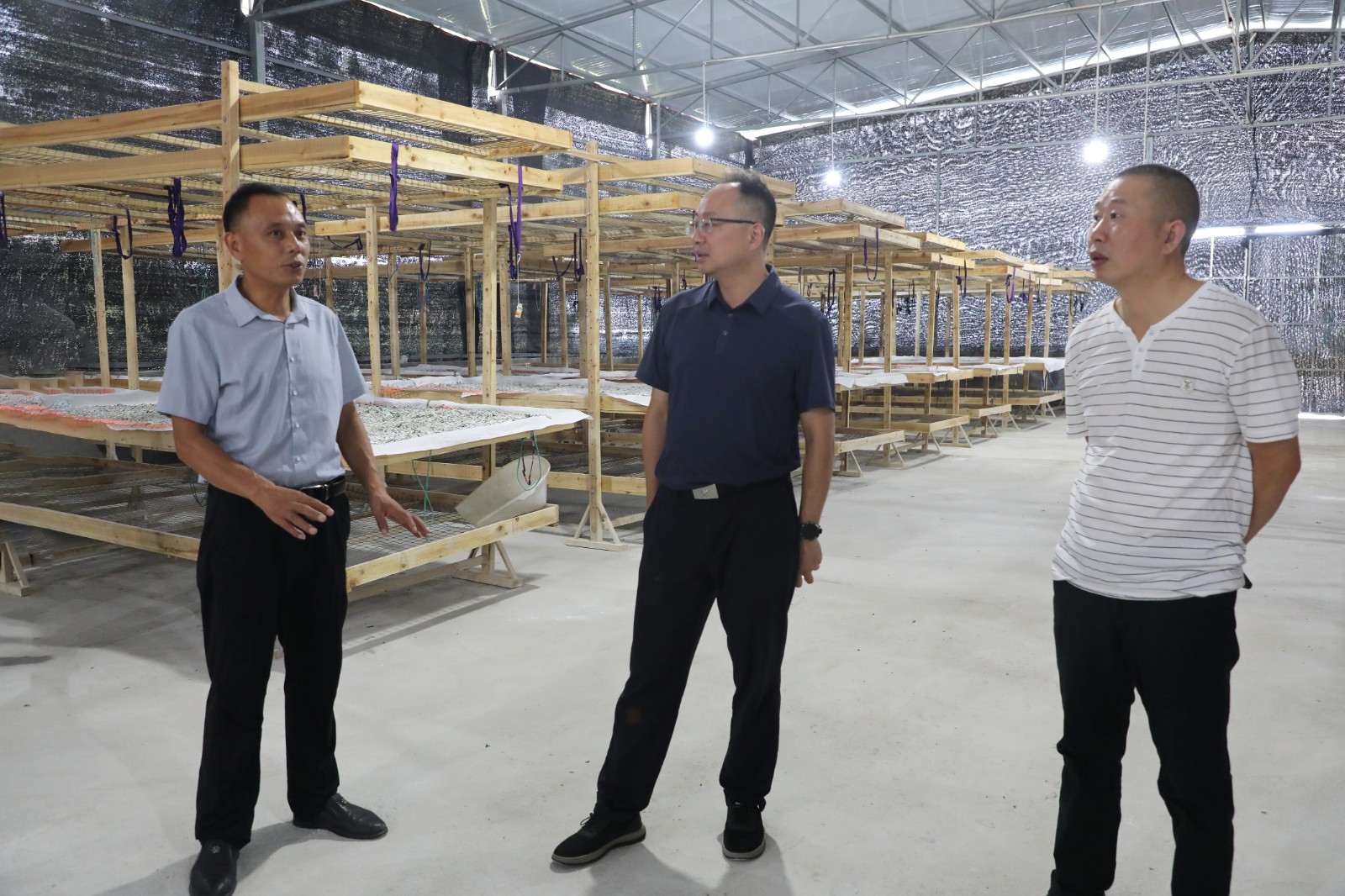 8月13日至14日,集团公司党委副书记、工会主席谢建国,党群工作部部长姚建军一行,前往仪陇县大寅镇,就对接的托底性帮扶“小而美”项目展开深入调研,重点考察蚕棚建设进展与蚕茧产销情况。
