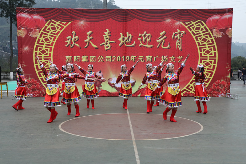 下午2点,广场文艺表演在矿区篮球场上演。由矿区健身队和犍为健身队联合表演的歌舞节目次第登场赏心悦目。既有《鼓动天地》、《荞麦花》、《洗衣舞》一类的传统舞蹈,也有《巴拿马》等节奏明快的现代舞,欢歌热舞带来新一年的吉祥好运。看台上观众不时报以热烈的掌声,还有不少观众举起手中的手机按下快门记录下这美妙的瞬间。