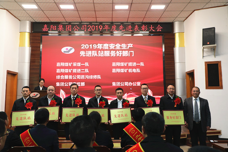 总经理范勤英为先进车间、队站和服务好部门颁奖。2019年先进车间是:嘉阳煤矿;2019年先进队站他们是:嘉阳煤矿采煤一队、嘉阳煤矿掘进一队、嘉阳煤矿掘进二队、嘉阳煤矿机电队、综合服务公司芭沟综修队;2019年服务好部门他们是:集团公司安监部、集团公司办公室。
