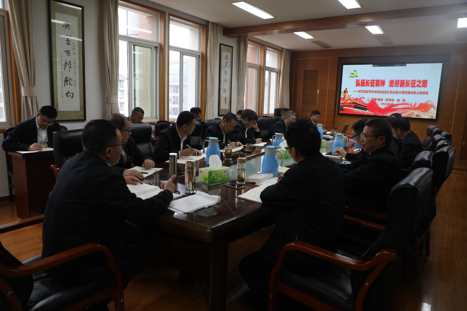 党委书记、董事长杜勤同志以《论中国共产党史》一书中“习近平总书记在纪念红军长征80周年座谈会上的讲话”为内容,深刻领会长征精神的内涵实质。伟大长征精神就是把全国人民和中华民族的根本利益看得高于一切,坚定革命的理想和信念,坚信正义事业必然胜利的精神;就是为了救国救民,不怕任何艰难险阻,不惜付出一切的牺牲精神;就是坚持独立自主、实事求是,一切从实际出发的精神;就是顾全大局、严守纪律、紧密团结的精神;就是紧紧依靠人民群众,同人民群众生死相依、患难与共、艰苦奋斗的精神。他指出,我们要从长征精神中汲取智慧力量,围绕实现“两个一百年”奋斗目标、实现中华民族伟大复兴的中国梦而不懈奋斗。对我们企业而言,努力实现企业发展稳定,长治久安;努力提升职工的幸福感、获得感,打造百年嘉阳、重现企业辉煌实现企业高质量发展就是我们的奋斗目标;要实现这一目标就必须要更加坚定理想信念,脚踏实地、真抓实干,发扬百折不挠的革命主义精神,党员干部要切实履行责任和义务,充分发挥先锋模范作用,继承和发扬嘉阳“艰苦奋斗、求实奋进”的优良传统,进一步提高矿井自动化、智能化水平,提升安全保障能力,巩固煤炭主业,为实现百年嘉阳梦想不懈奋斗。