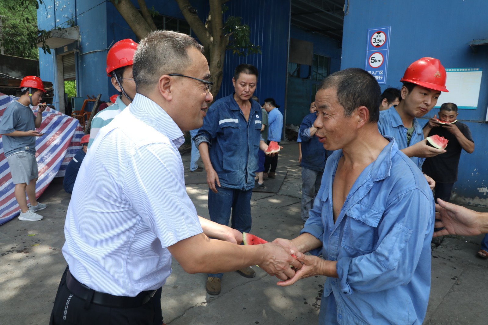 7月20日下午,机关第一党支部和机关一分会党员职工代表前往矿山机电制造维修分公司,向奋战在高温一线的职工送去西瓜、矿泉水,表达组织的关心、关爱,并检查防暑降温工作落实情况。