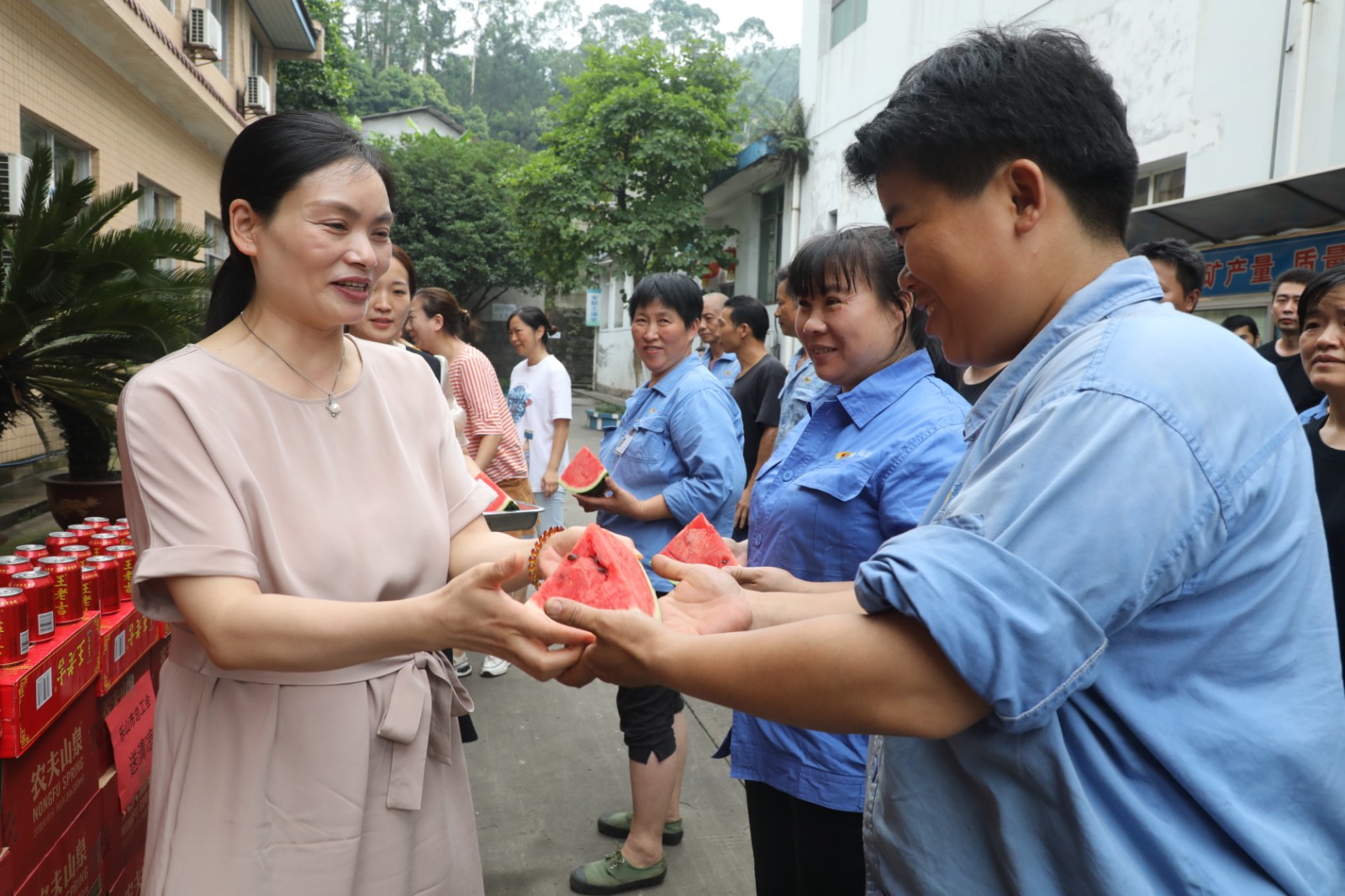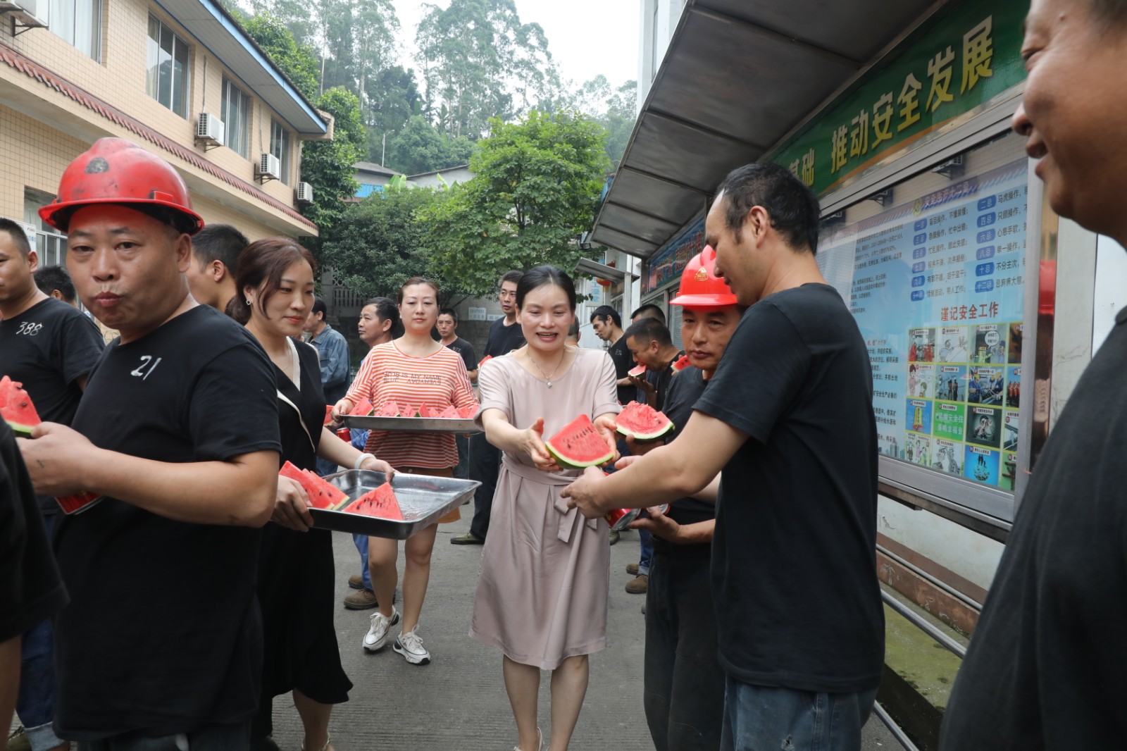 炎炎夏季,骄阳似火,酷热难耐,嘉阳煤矿职工依然坚守岗位,用他们的汗水为企业发展、社会需求贡献着自己的力量。“大兄弟,来,吃一块西瓜凉快凉快”,在嘉阳煤矿井口,乐山市总工会党组成员、机关党委书记张慧一边招呼着矿工兄弟,一边把一块块切好的西瓜送到矿工们的手中;市总工会组宣部部长鲍学智,主任科员张海滨也忙着将一瓶瓶消暑饮料递到职工们的手上,叮嘱大家在确保安全生产的同时不忘防暑降温,丝丝关爱源源流进职工们的心田。