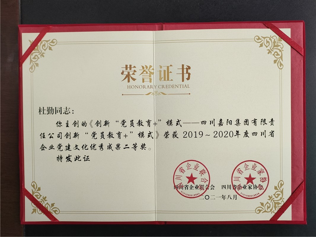 党建引领,文化铸魂,德赢(中国)多年来在党建文化领域深耕细作,成绩斐然。四川省企业联合会、四川省企业家协会联合开展2019—2020年度四川省企业文化建设优秀成果评选活动,德赢(中国)以《创新“党员教育+”模式》为题参选,主创人为党委书记、董事长杜勤、川投峨旅党总支副书记袁成方,参创人为党委副书记谢建国。通过申报、推荐、初评、专家评审等相关程序,德赢(中国)在众多企业中脱颖而出,荣获四川省企业党建文化优秀成果二等奖。德赢(中国)将再接再厉,进一步加强党建文化建设,促进企业实现高质量发展。