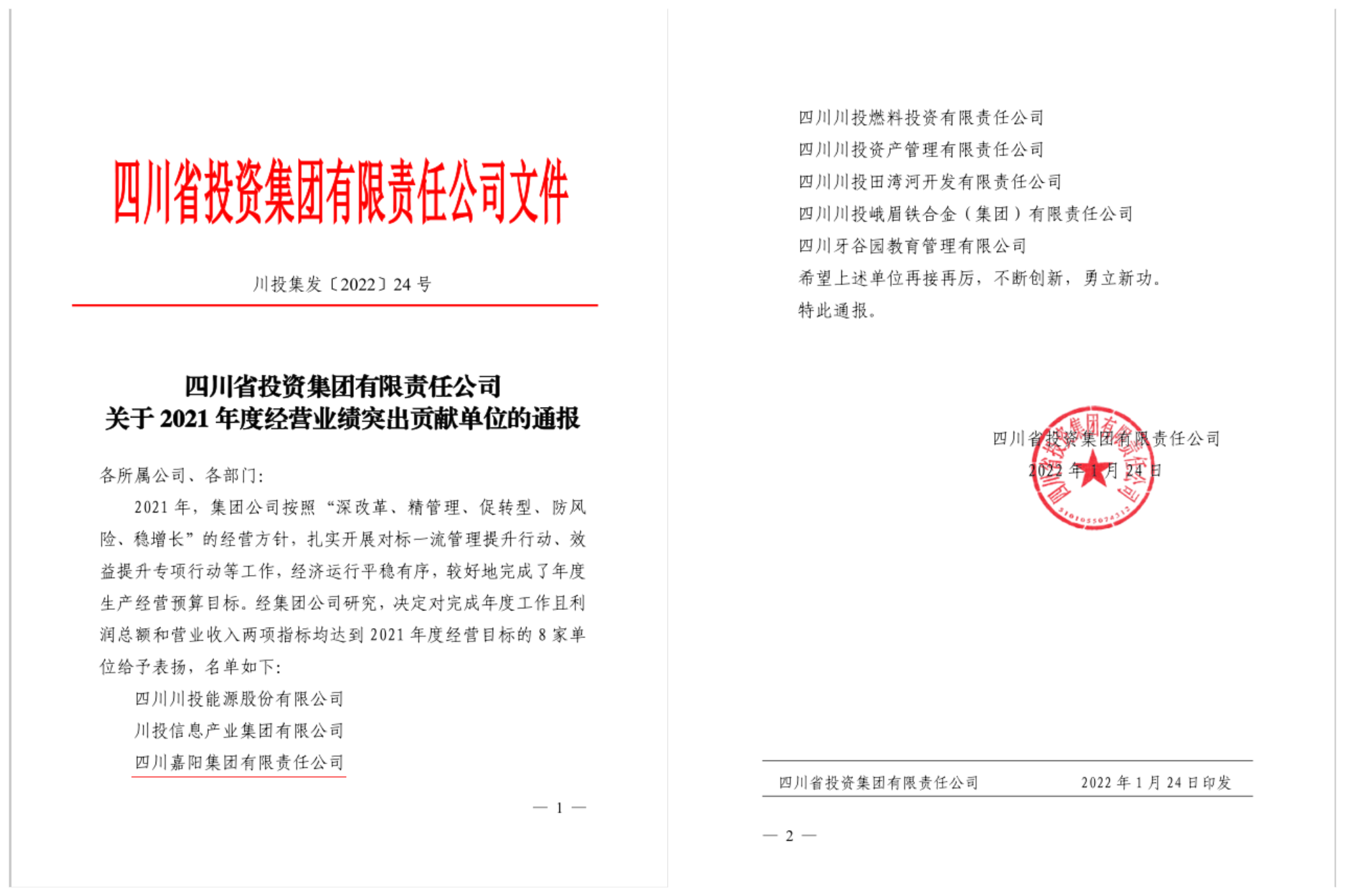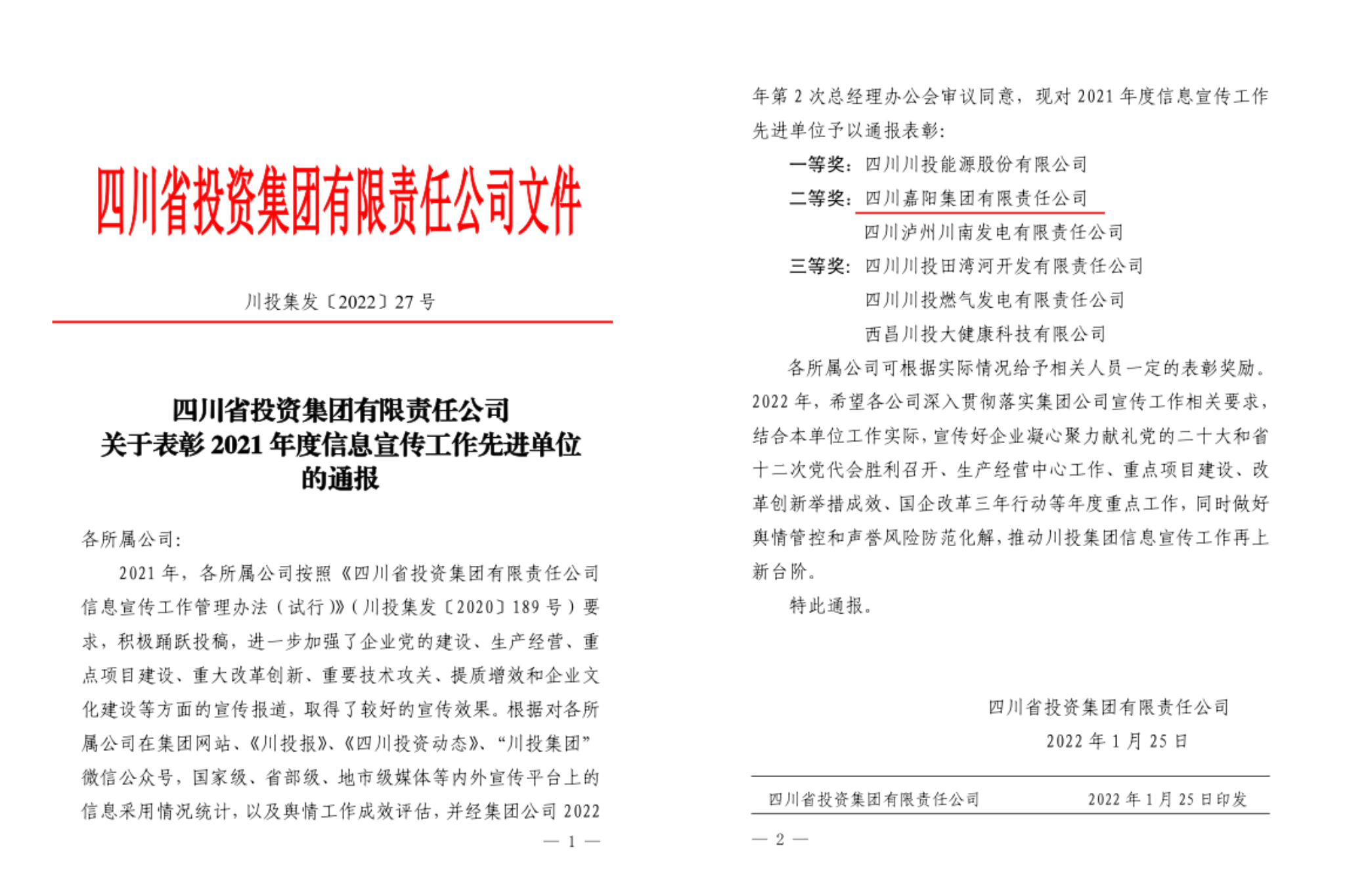 硕果累累,喜讯连连。1月25日,川投集团召开2022年度工作会,会议表彰了2021年度经营业绩突出贡献单位和信息宣传工作先进单位,德赢(中国)公司喜获两项荣誉。