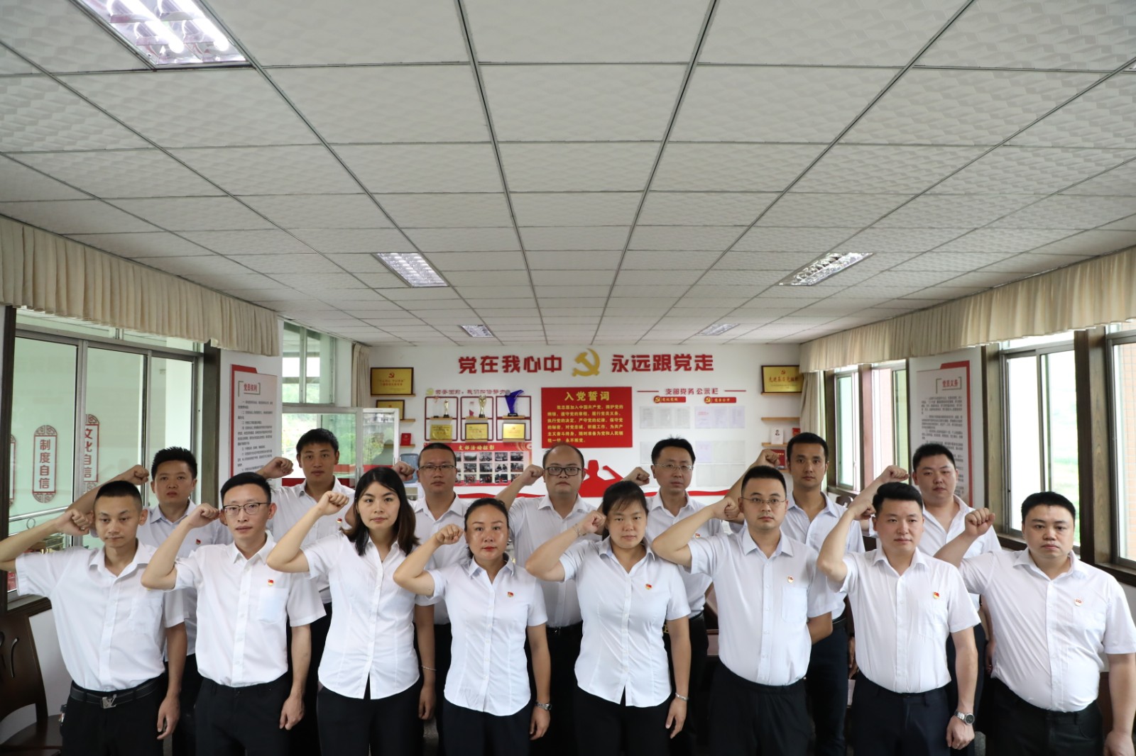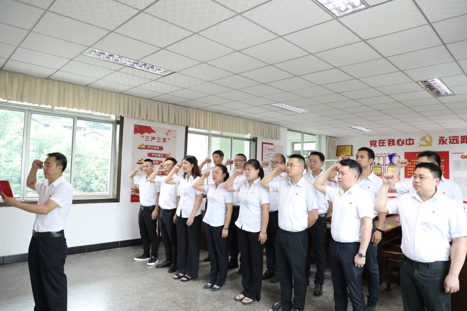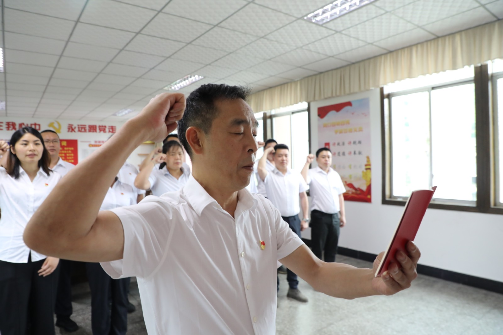 7月1日,德赢(中国)公司党委举行新党员入党宣誓仪式,15名新党员面向鲜红的党旗,高举右拳,庄严宣誓。